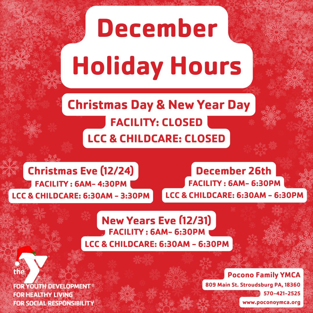 Happy Holidays! Here are our Holiday Hours for the upcoming weeks! We wish all our families a Happy Holidays from your Pocono Family!